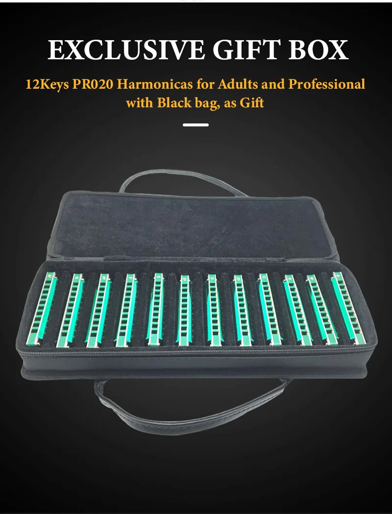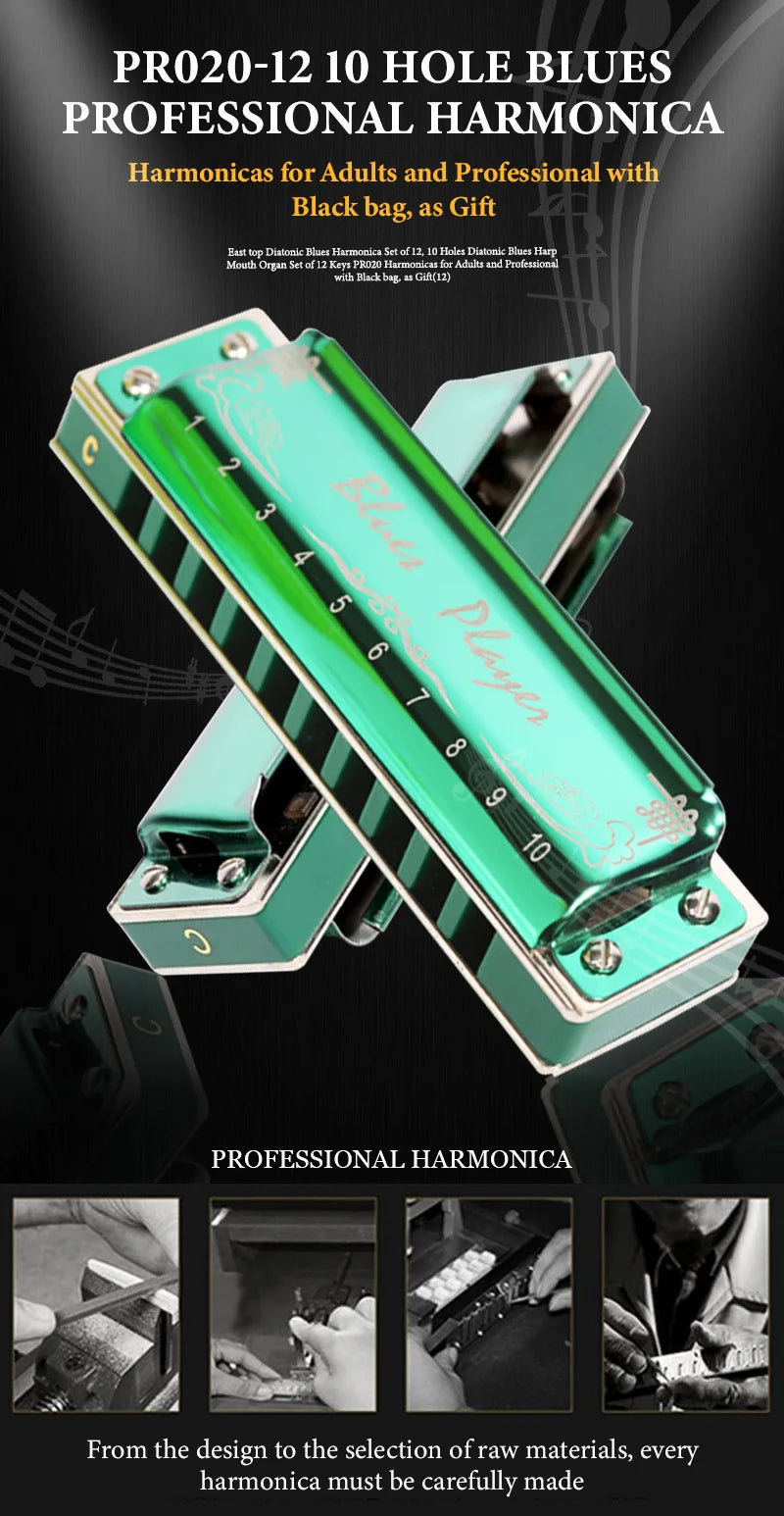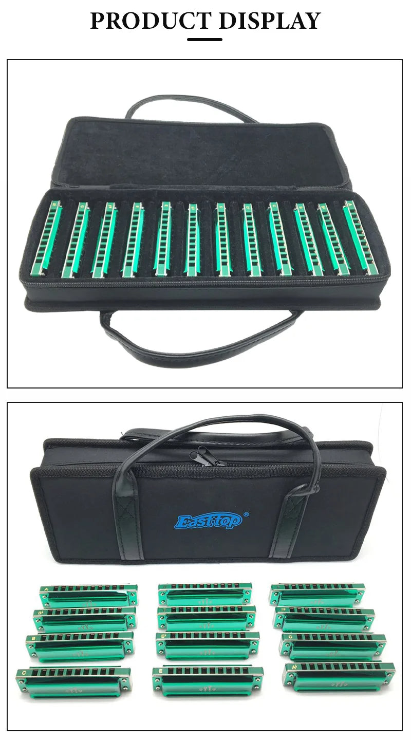 EASTTOP PR020 Mundharmonika mit 10 Löchern, diatonische Blues-Harfe, 12er-Set für Erwachsene und Profis, mit schwarzer Tasche