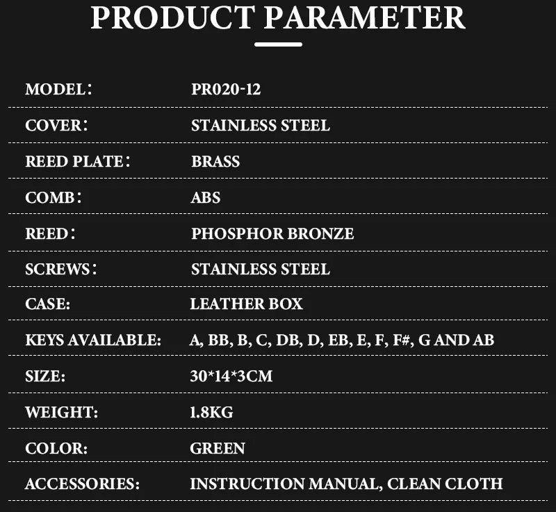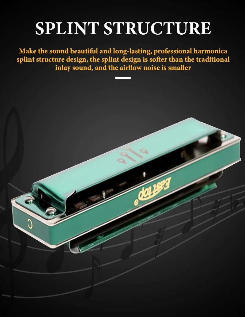 Satter Klang, reaktionsschnell, luftdicht – Präzisionsgefertigter Kunststoffkamm mit Stimmzungen aus Phosphorbronze; Die 1,2 mm dicke Stimmplatte ermöglicht eine höhere Tonhöhe, einen satten Klang und eine bessere Klangfarbe. Die Stimmplatte mit galvanischem Rostschutz, das Loch und der Stimmspalt sind nach dem Galvanisieren besser. Gleichzeitig fühlen Sie sich beim Spielen wohl und können die Fertigkeiten wie Überblasen und Bending einfach anwenden, was dem Interpreten ein neues Erlebnis bietet.