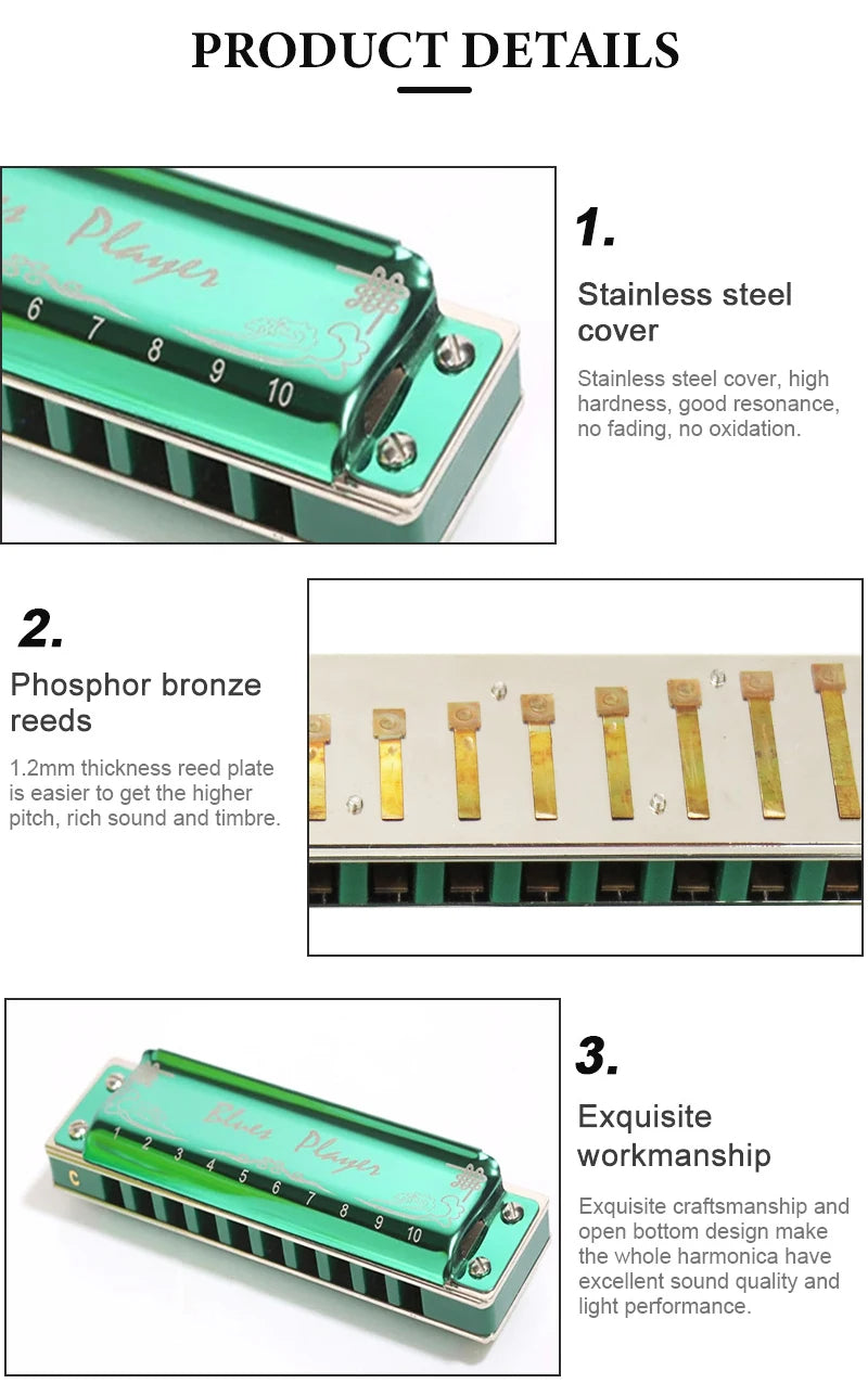 Professionelle Mundharmonika für Erwachsene – professionelle diatonische Mundharmonika mit 10 Löchern im Osten, geeignet für Blues, Folk, Rock, Country, Jazz usw. Ideal für professionelle Mundharmonikaspieler und Anfänger. Diese professionelle Blues-Mundharmonika verfügt über eine exquisite Verarbeitung, ein schönes Aussehen, einen präzisen Ton und eine gute Reaktionsfähigkeit.